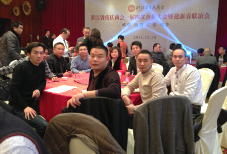2013.12.28日,应浙江省重庆商会会长沈明的邀请,乐清市重庆商会会长胡春波、秘书长高文松、常务副会长周前伍、副秘书长李海波、副会长张宜龙,徐林、赵清华等一行参加浙江省重庆商会2013年新春联谊会;并与到会的义乌市重庆商会陈从良、宁波市重庆商会周代凡等进行了深人的交流与沟通;